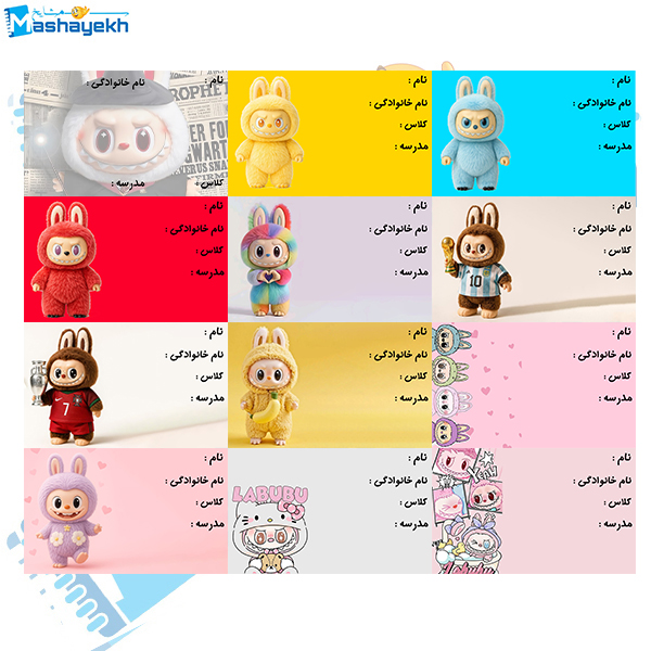 برچسب نام و نام خانوادگی مشایخ طرح لبوبو (LABUBU) کد BR945 بسته 25 عددی، با طراحی فانتزی و جذاب، مناسب استفاده روی دفتر، کتاب و لوازمالتحریر شخصی است.