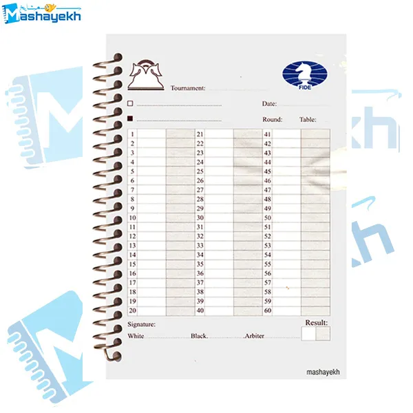 دفتر ثبت حرکات شطرنج ۶۰ برگ مشایخ مدل CHESS06 ساخته شده برای بازیکنانی که میخوان بازیهاشون رو تحلیل و پیشرفت خودشون رو دنبال کنن.